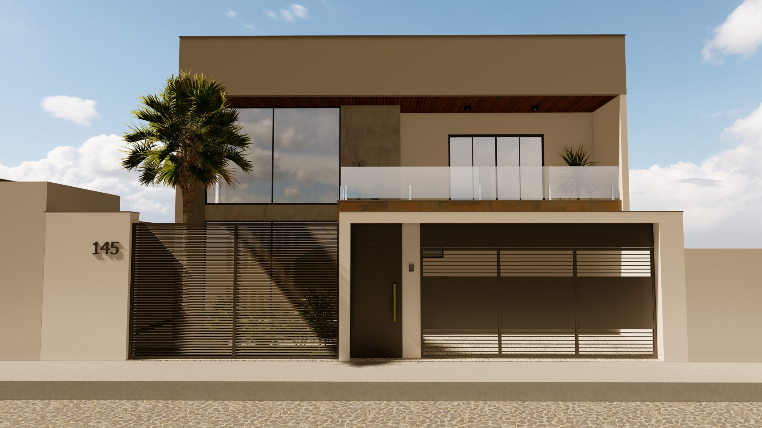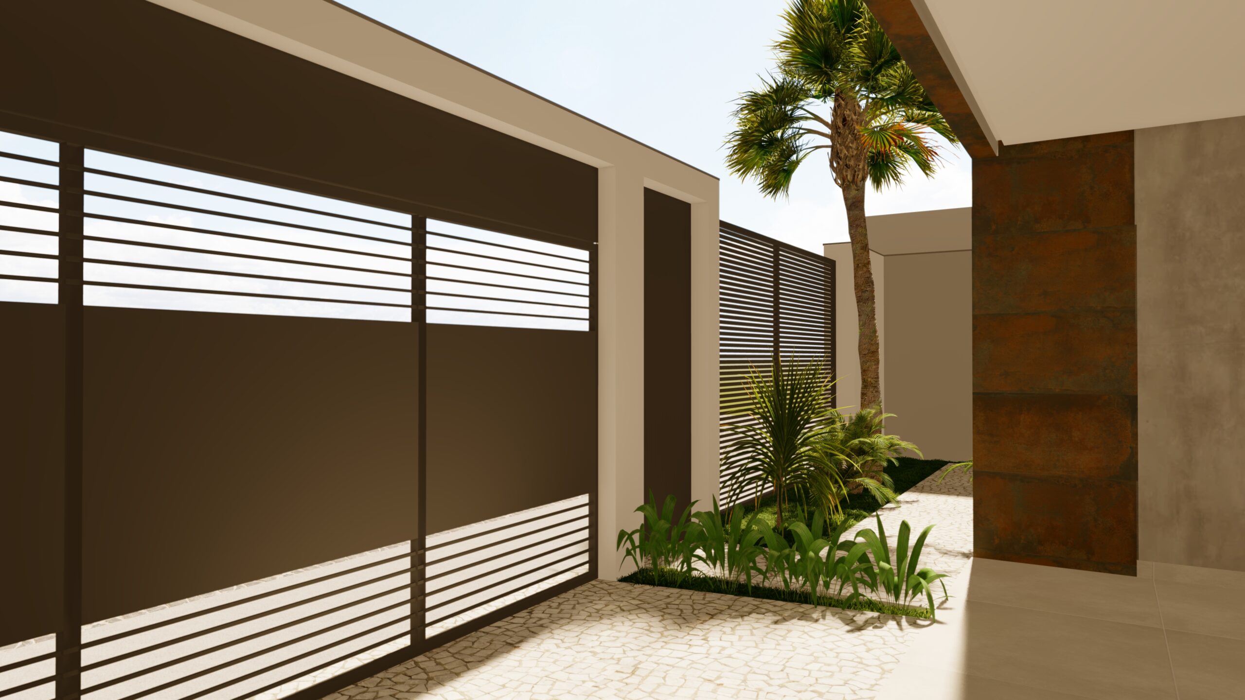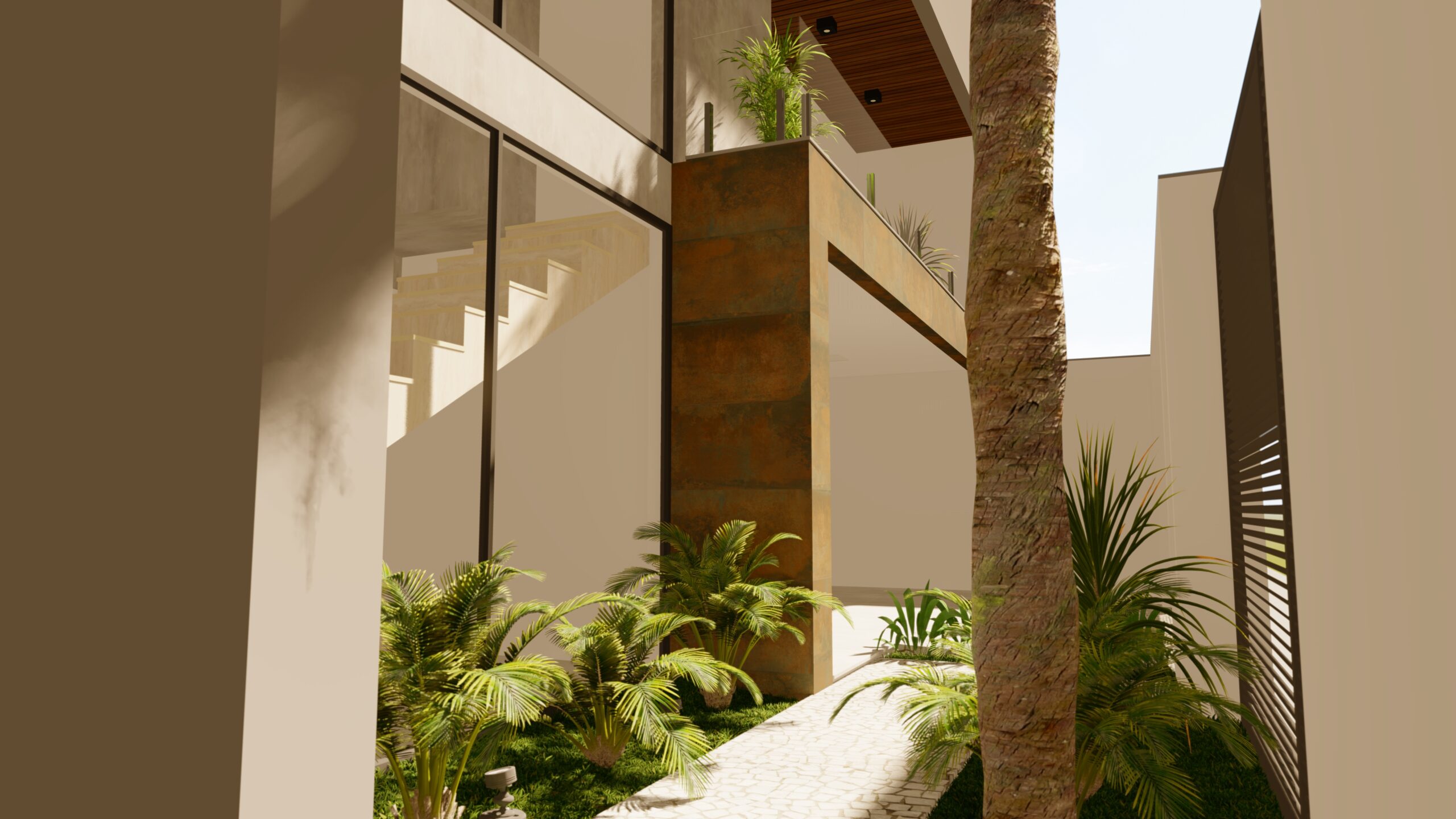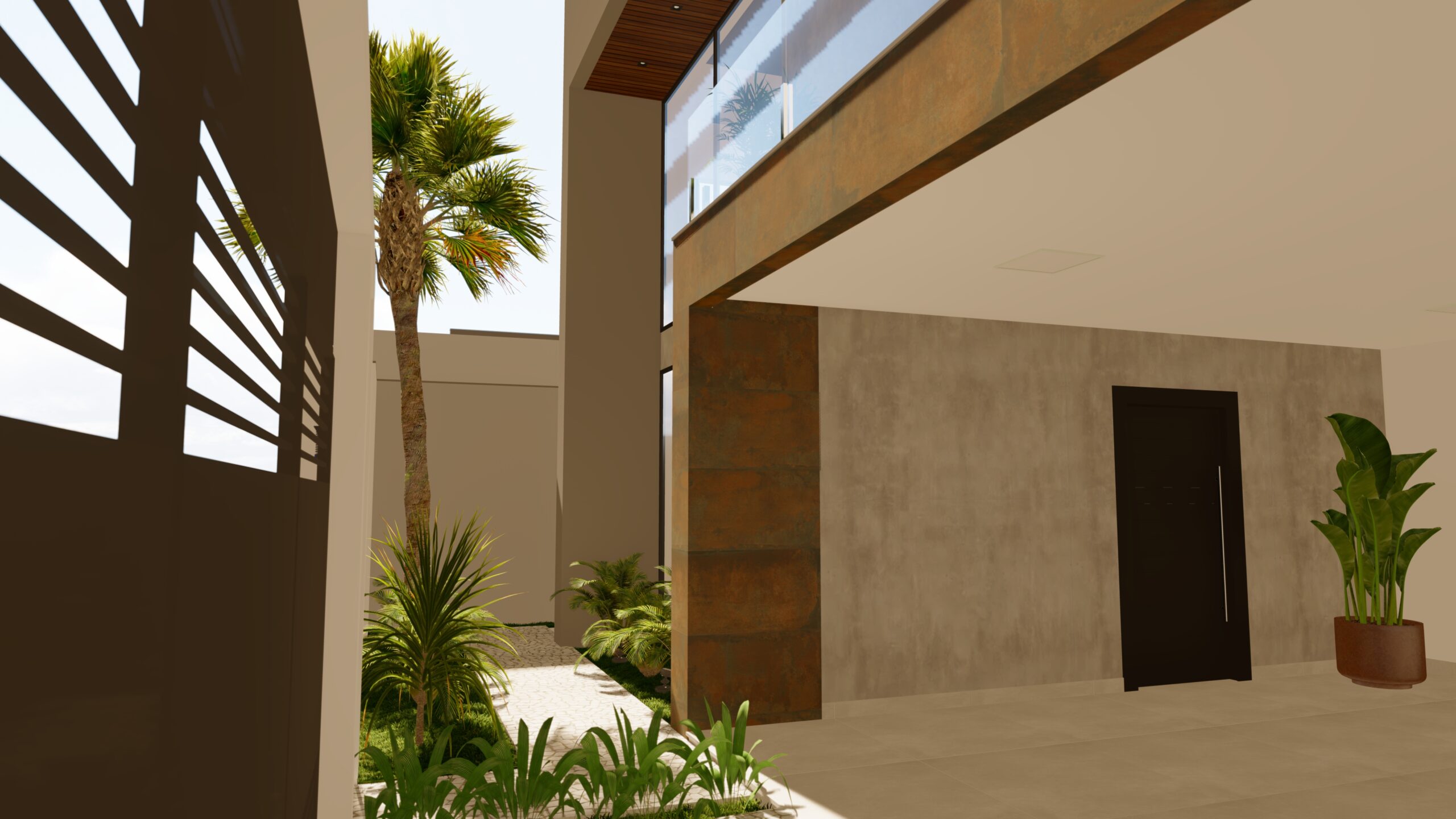 CASA BOX Base minimalista, design de linhas retas, vidro e aço corten para quebrar a paleta monocromática.