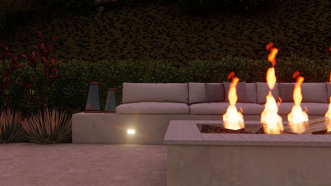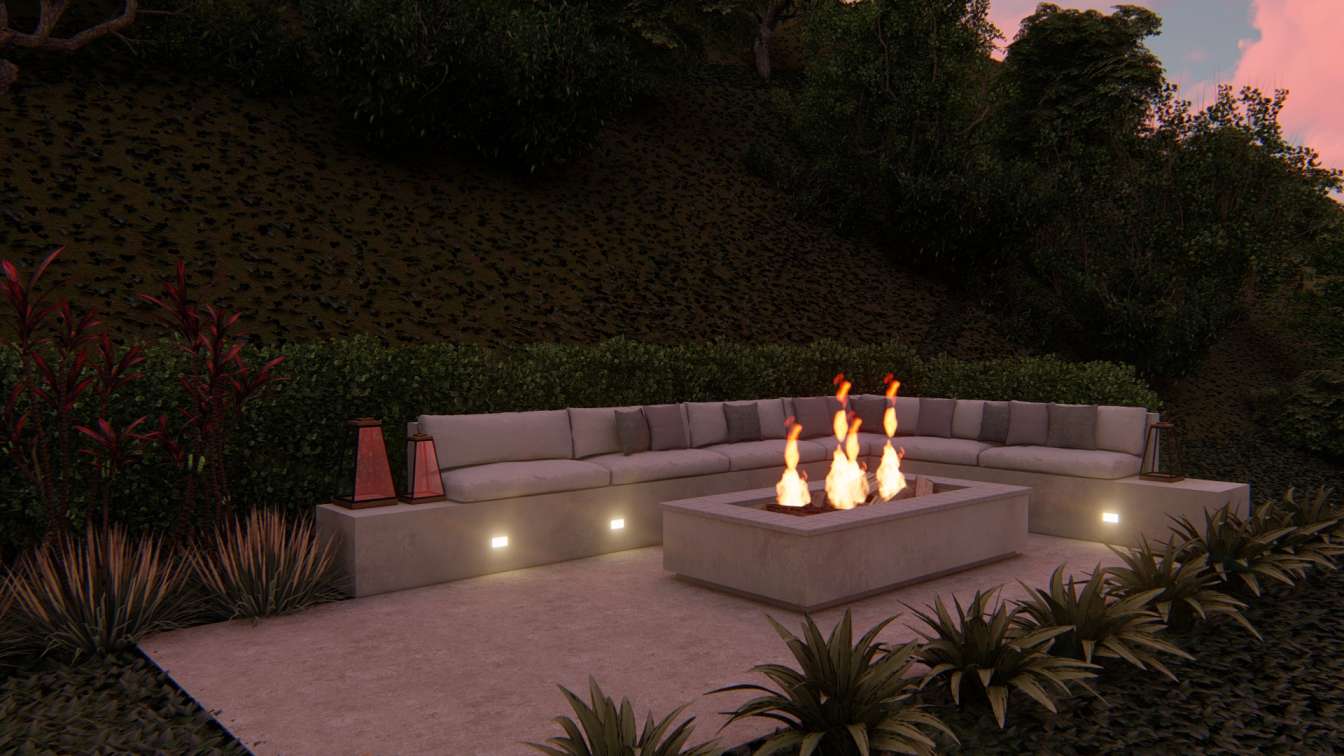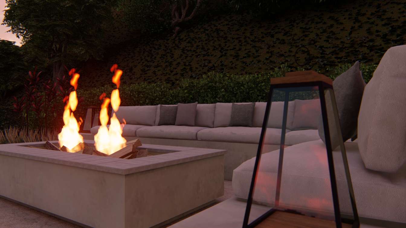 FOGO DE CHÃO AO POR DO SOL Localizada em um trecho alto do terreno e a natureza como pano de fundo, o espaço da lareira externa permite a visão do pôr do sol e convida o espectador para apreciar o entorno.