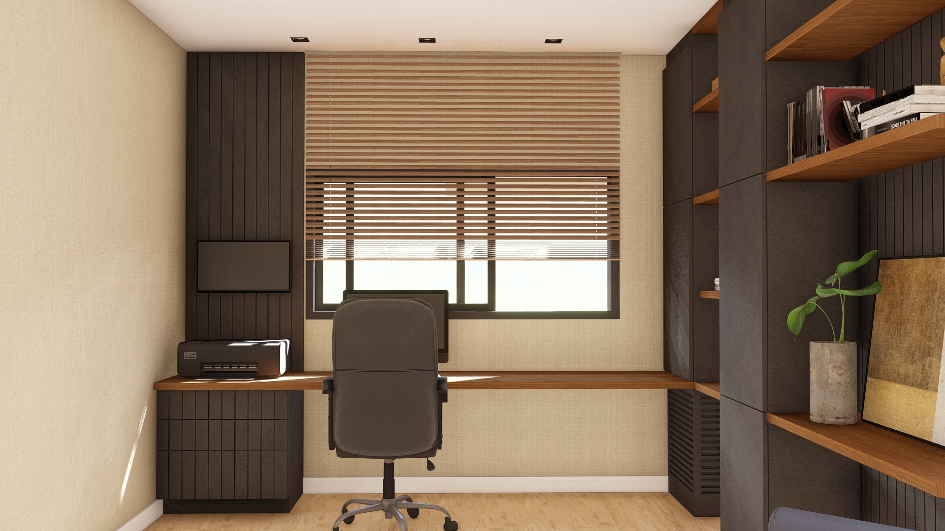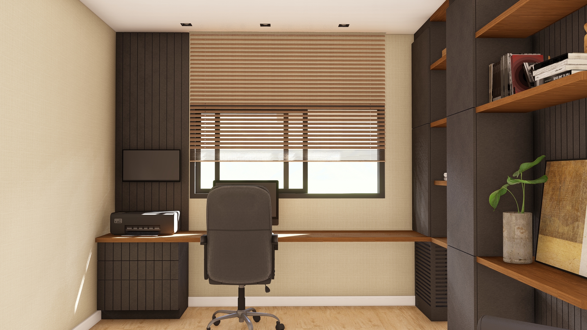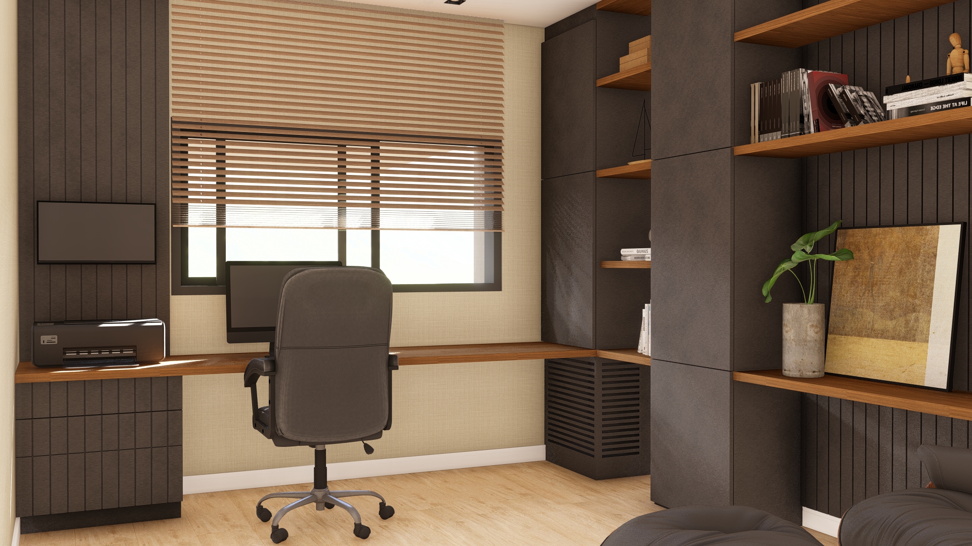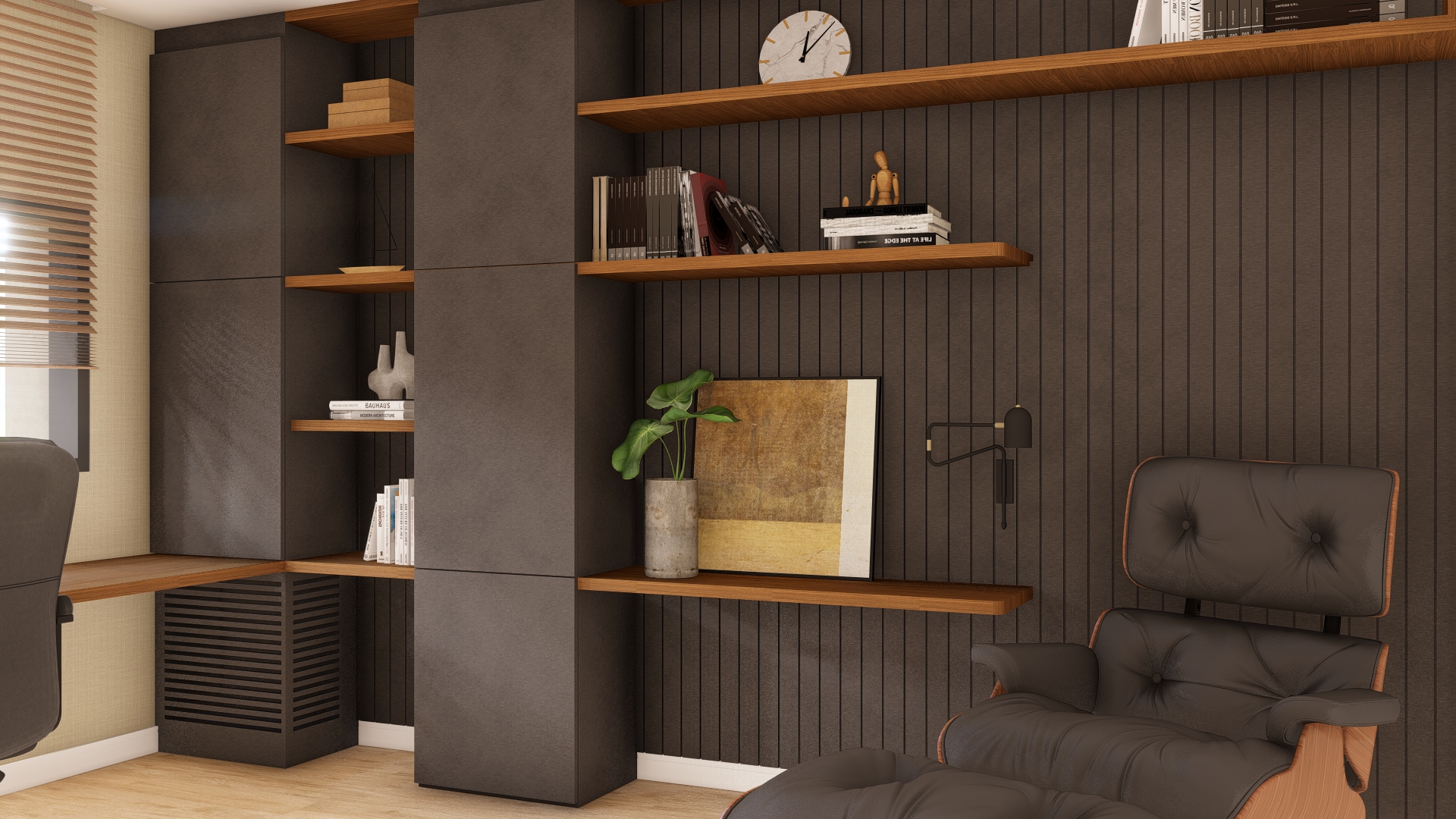 O home office pode se tornar um momento super agradável e produtivo. Neste projeto a estrela é a icônica poltrona Charles Eames para o canto de leitura. O conjunto da marcenaria, a paleta de cores e a iluminação foram cuidadosamente pensados para atender as expectativas do cliente.